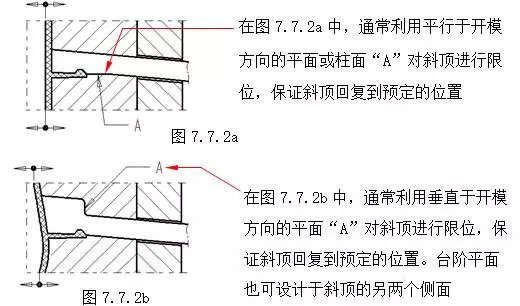 在斜頂機構中,為了保證斜頂工作穩(wěn)定、可靠,應該注意以下幾點:(A)斜頂?shù)膭傂浴T鰪娦表攧傂砸话悴捎茫?/span>1.在結構允許的情況下,盡量加大斜頂橫斷面尺寸。(參見第七章7.2節(jié))2.在可以滿足側向出模的情況下,斜頂?shù)男倍冉恰癆”盡量選用較小角度,斜角A一般不大于20°,并且將斜頂?shù)膫认蚴芰c下移,如增加圖7.7.1a中的鑲塊2,同時鑲塊可以具有較高的硬度,提高 模具 的壽命。(B)斜頂橫向移動空間。如圖7.7.1a所示尺寸“D”,為了保證斜頂在頂出時不與膠件上的其它結構發(fā)生干涉,應充分考慮斜頂?shù)膫认蚍帜>嚯x、斜頂?shù)男倍冉恰癆”,以保證有足夠的橫向移動空間“D”。(C)斜頂在開模方向的復位。為了保證合模后,斜頂回復到預定的位置,一般采用下面的結構形式。如圖7.7.2a;7.7.2b。
