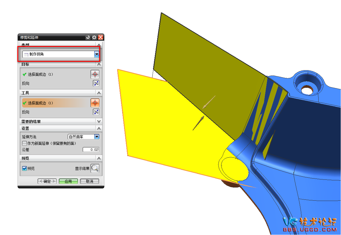 2.用“修剪和延伸”命令將兩個面創建拐角,注意類型選擇制作拐角,結果如圖所示